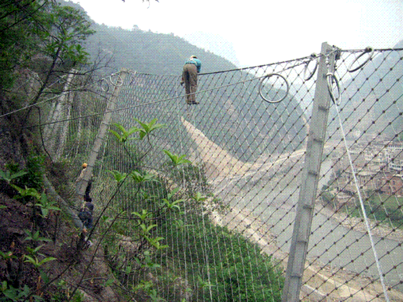 网型:R19/3/300 SO/2.2/50结构配置: 钢柱+支撑绳+拉锚绳+缝合绳+减压环[钢柱( 间距10M)
